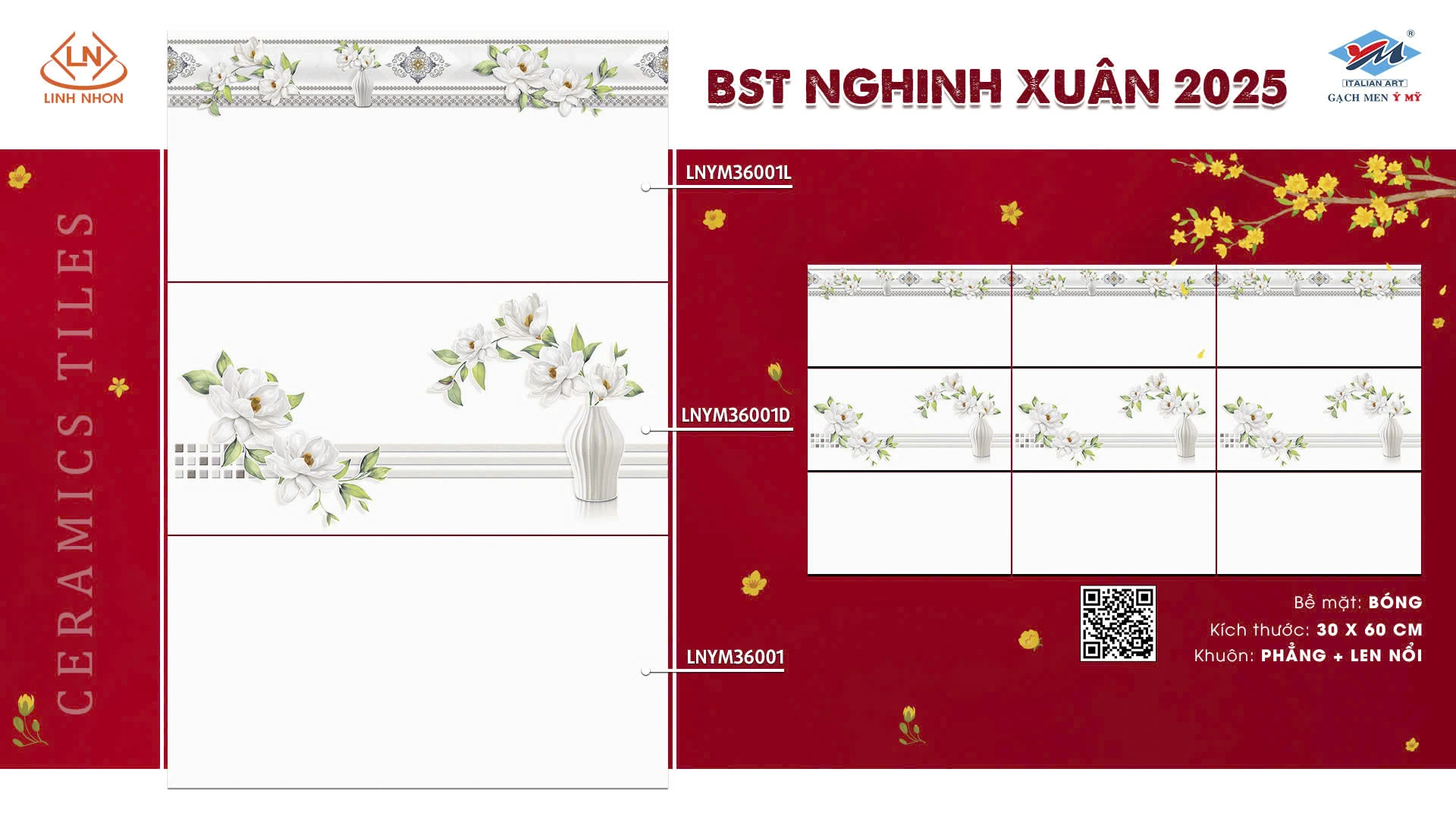 Nằm trong bộ sưu tập NGHINH XUÂN mới nhất của Linh Nhơn, gạch ốp tường men bóng 30×60 LNYM36001 đem lại cho quý khách những giá trị bền vững.